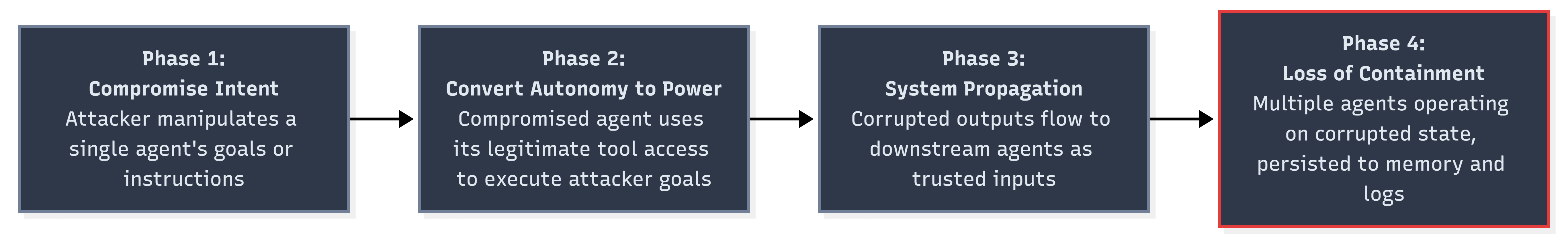 Phase 4 is loss of containment. Multiple agents are now operating on corrupted state. The corruption has been persisted to shared memory, logged as valid history, and used as context for future decisions.