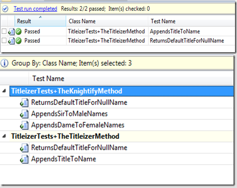 I like how the results are better structured as a result of this test code structure without having to repeat initialization code. The problem with this approach is that it violates Code Analysis rule CA1034: Nested types should not be visible. I know this is a test class and not production code, so maybe I am pointing out something that is not worth pointing out. The thing is I have been bitten a few times by thinking it is OK to ignore Code Analysis rules so I have to do my due diligence to insure this won’t cause issues down the road. Also IMHO, test code should be as good as production code.
