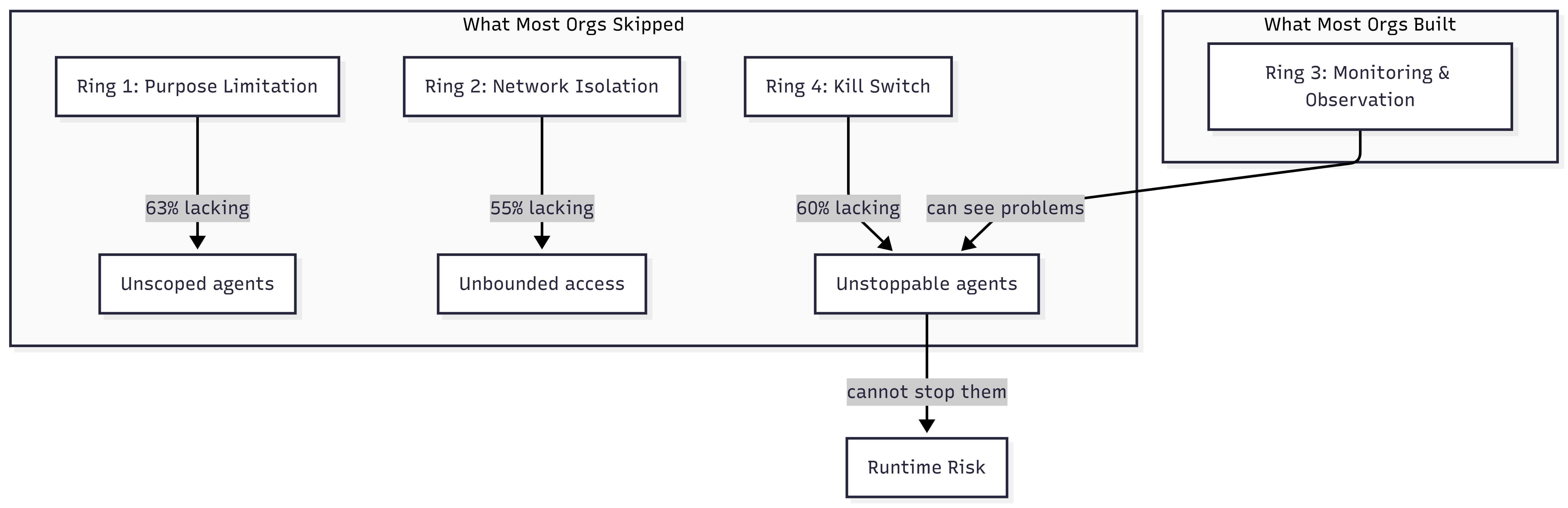 The pattern is clear. Organizations invested in Ring 3 and skipped Rings 1, 2, and 4. They built the middle of the defense and left the boundaries open. This is precisely what How Agents Stay in Bounds predicted: every ring you skip is a ring you inherit as runtime risk.