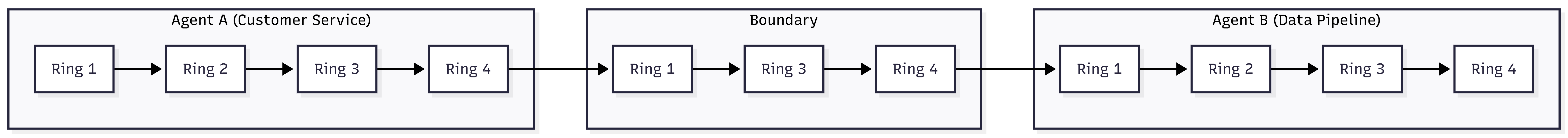 How Agents Stay in Bounds defined containment at the boundary, not the agent. Ring 1 scopes the inputs an agent receives. Ring 2 isolates the environment it runs in. Ring 3 validates its outputs. Ring 4 gates its promotion. These rings apply at every boundary in a multi-agent system, not just the boundary around each individual agent. The handoff from one agent to another is a boundary. The data flow between agent-enabled applications is a boundary. The integration point where an agent’s output becomes another agent’s input is a boundary.